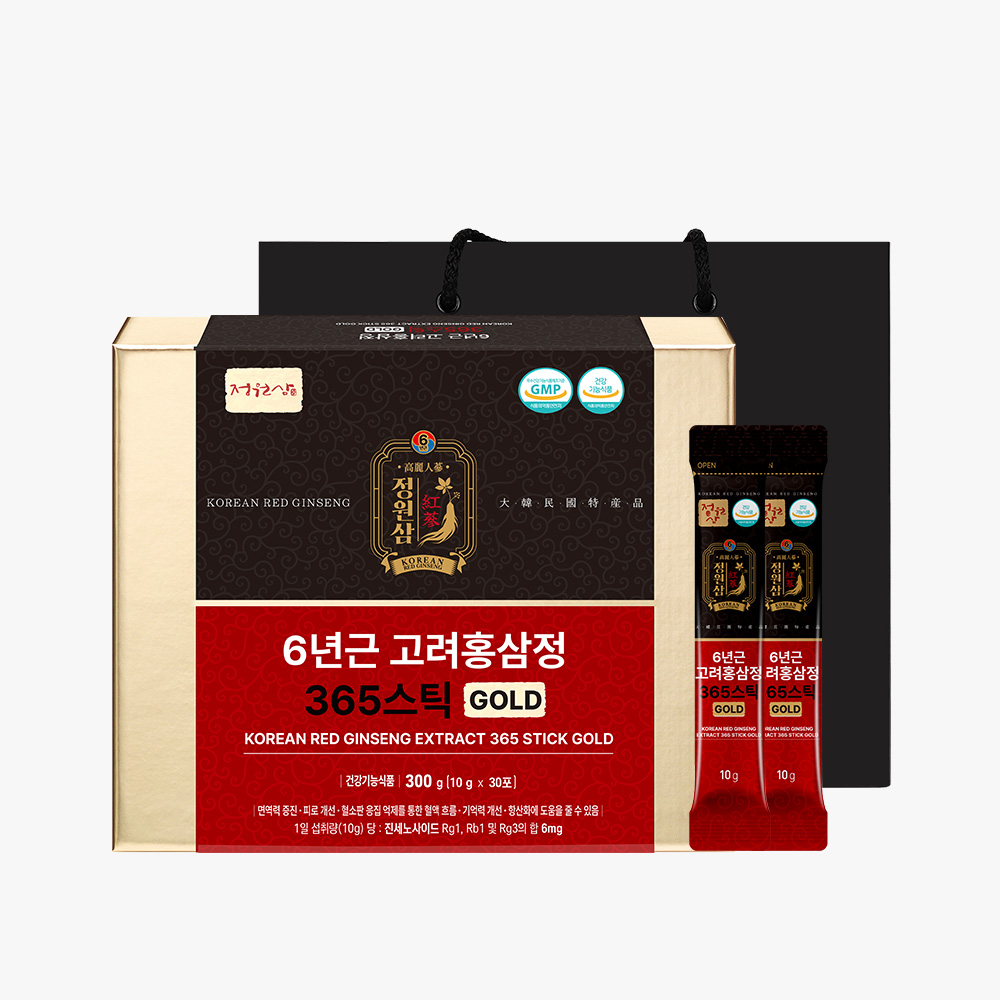 Red ginseng concentrate (6 years old, solids ≥60%, ginsenosides Rg1, Rb1, and Rg3 total 11mg/g, Korea) 6% (ginseng blend ratio: 70% root, 30% fine root), Maltodextrin, Fructooligosaccharides, Plant concentrate (Eucommia bark: Korea, Peony root: Korea, Reishi mushroom, Solomon’s seal root, Citrus peel, Polygonum multiflorum root, Prepared rehmannia root, Poria sclerotium, Kudzu root, Korean black raspberry, Goji berry, Angelica root, Cinnamon twig), Purified water.